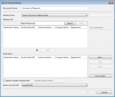 If [Retrieve fax number when sending fax from properties of document] is selected in the Desktop Browser system settings, a fax number that is automatically retrieved from the property of document appears in [Destination] in the [Fax Sending Settings] dialog box.