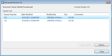 You can select a document from [Version List] in the [Document Version List] dialog box and click [Export] to save the selected version of the document in a Windows Folder. For more information, see the following.