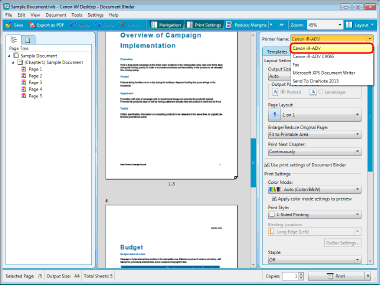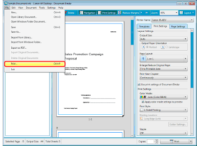 If you are using a binder document, the print settings stored in the binder document are used when printing. For details on the print settings, see the following.
