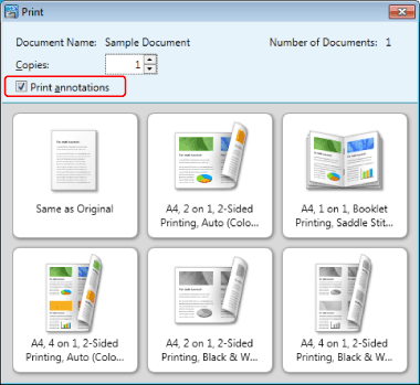 When printing, you can also use print templates registered in Document Binder. Print templates include frequently used print settings registered by default and user-defined ones that you add. For more information on print templates, see the following.