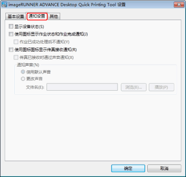 如果选中 [使用图标显示作业状态和作业完成通知],则当进行作业时在 Quick Printing Tool 中显示作业状态图标,并且作业完成后显示一条消息。作业状态图标指示在 Quick Printing Tool 中设置的打印机/传真的作业状态。有关作业状态图标和完成消息的详细信息,请参阅下列内容。