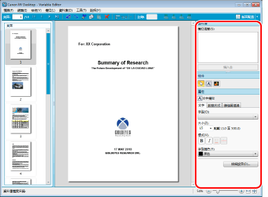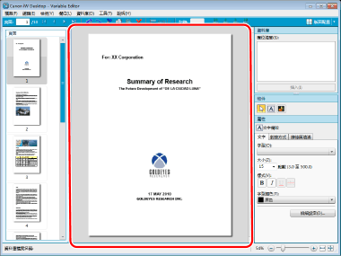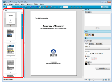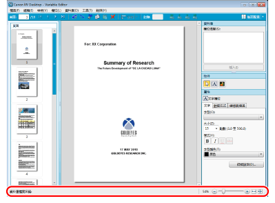 Variable Editor 螢幕中用於顯示文件預覽的工作區域、選取頁面的區域,以及設定變數欄位的區域,即稱為「窗格」。