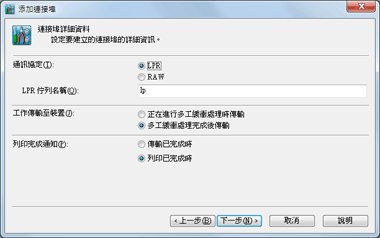 指定已設定印表機中的列印通訊協定使用的是 LPR 或 RAW。若在「建立連接埠」對話方塊中選取的裝置不支援 RAW 則您無法選取 RAW。