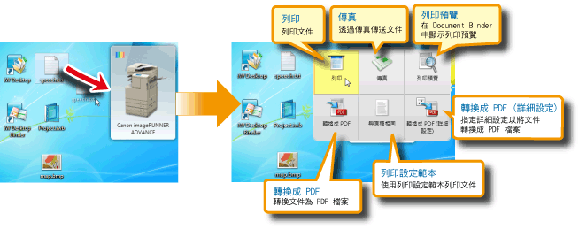 Quick Printing Tool 應用程式可以讓您更直觀地操作裝置功能,如列印及傳送傳真等等。和 Printer Monitor 一樣,其也可監視外部裝置 (如 imageRUNNER ADVANCE 裝置) 及列印程序的狀態,以及管理列印、傳送及接收傳真的日誌。
