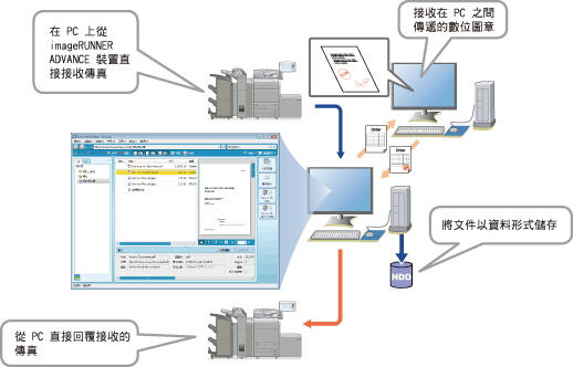 將 Desktop 的功能與裝置相結合,您可以資料的形式儲存已接收的傳真文件以便管理、在電腦上檢查其內容及輸入註解。