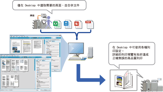 透過 Desktop,您可將列印設定和文件一起儲存。這可讓您輕鬆執行列印,而不必重新指定列印設定。由於在 Desktop 中可以將不同副檔名的多個文件合併至單一文件,因此可以避免發生一些錯誤,例如不小心列印相同文件兩次,或為文件指定不同的列印設定。