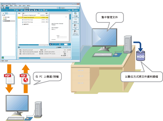 透過 Desktop,您可集中管理各種格式的文件。即使程式庫中儲存大量的文件,您也可以使用搜尋功能輕鬆找到文件。此外,您還可在網路上使用共用資料夾的成員之間傳送和接收檔案 (文件)。