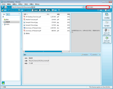(更改文件列表视图)在 [大缩略图]、[中缩略图]、[小缩略图]和[列表]之间切换搜索结果的显示。可在搜索屏幕中的搜索栏预览找到的文档。有关详细信息,请参阅下列内容。