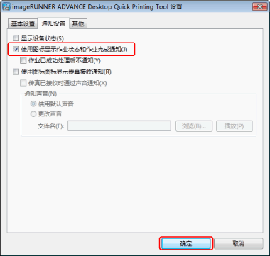 如果未配置应用程序支持的端口,请选择 [使用图标显示作业状态和作业完成通知],然后在设置中单击 [确定] 以自动更改端口。