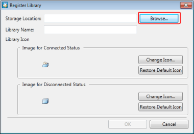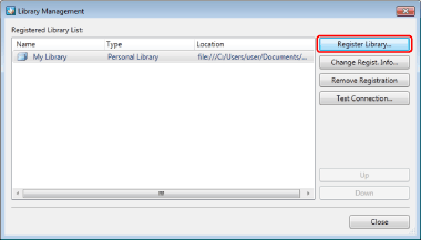 To edit a registered library's information, select the [Settings] menu > [Library Management], and open the [Library Management] dialog box. Select the library that you want to edit, and select [Change Regist. Info]. The following steps are the same as those to register a library.