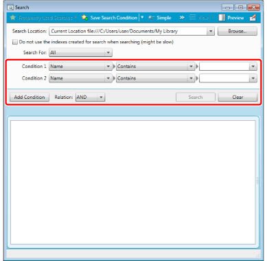 According to your computer settings, you can select [Do not use the indexes created for search when searching (might be slow)] when you do not want to use indexes in searches. Note that this check box is not displayed when you select a library other than personal library as the search target.