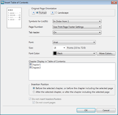 If [Do not insert headers/footers] is selected, you can select whether or not to include the table of contents chapter in the page count.