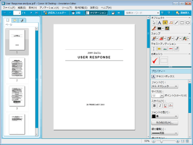 Annotation Editorは、PDF文書やDocument Binderで作成したバインダー文書に、テキストや図形などのアノテーションを追加できます。これにより、付箋を付けたり、マーカーで印を付けるなど、紙文書で行うのと同等の作業を電子文書で行えます。PDF文書へ追加したアノテーションは、Adobe Acrobatとも互換性を持ちます。アノテーションを追加した文書の保存の他、印刷やファクス送信を行えます。電子印鑑を利用できるため、Desktop Browserと連携すれば、回覧/承認作業を行うことができます。更に、署名付き電子印鑑を利用して、改ざんの検知も行えます。補足情報や参考画像を追加して、情報の集約に役立つだけでなく、セキュアな文書の作成にも役立ちます。