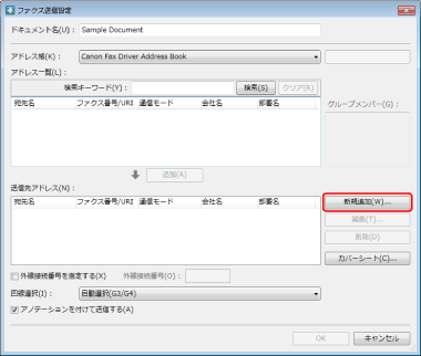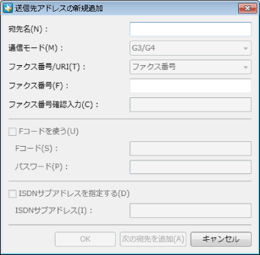 続けて別の送信先アドレスを設定する場合にクリックします。クリックすると、入力した送信先アドレスが[送信先アドレス]に反映されて、新規の[送信先アドレスの新規追加]ダイアログボックスに切り替わります。