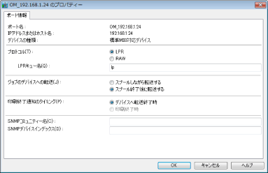[SNMPコミュニティー名]、[SNMPデバイスインデックス]は、標準MIB対応デバイスを使用するポートの場合に表示されます。キヤノン製品を使用するポートの場合は表示されません。ポートのプロパティーのみで表示され、ポートの作成時に設定することはできません。