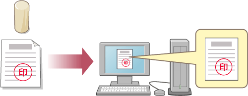 紙の文書に「捺印」し、内容を承認する代わりに、電子文書に電子印鑑を貼り付けて内容を承認できるので、紙に出力することなく、スムーズな承認業務を行えます。また、Desktop Browserの送信先トレイアウトプットアイコンを使うと、アノテーションや電子印鑑を付与した文書を共有フォルダーの間で回覧することもできます。