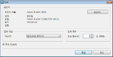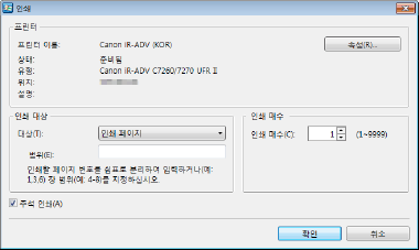 에서 인쇄 매수를 설정한 후 를 눌러 문서를 인쇄할 수도 있습니다. 풀다운 메뉴에서 다음 인쇄 방법을 지정할 수도 있습니다.모든 페이지 인쇄