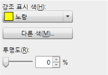 슬라이더 위치 및 숫자 값(%)이 텍스트 강조 표시의 투명도를 나타냅니다. 투명도를 변경하려면 왼쪽이나 오른쪽으로 슬라이더를 옮기거나, 숫자 값을 입력합니다.