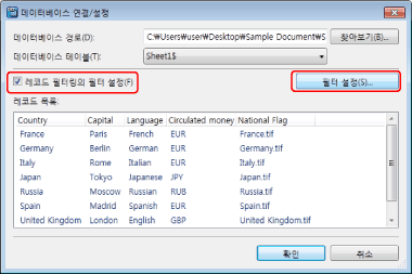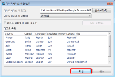 여러 시트가 포함된 Excel 파일을 연결 대상으로 설정하면 [데이터베이스 테이블]에서 데이터베이스로 사용할 시트를 선택할 수 있습니다.