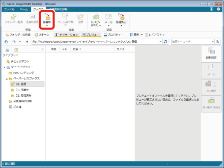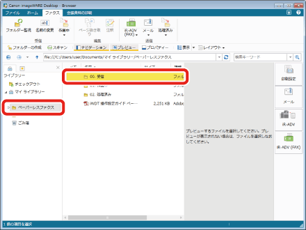 [ファクス]タブを選択し、リボンの表示を切り替えます。「ペーパーレスファクス」フォルダー内の「00. 受信」フォルダーを選択します。
