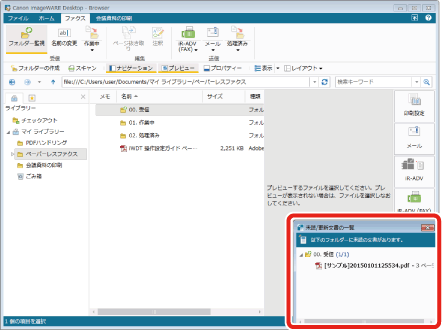 「00. 受信」フォルダーにファクスが保存されると、コンピューターの画面に[未読/更新文書の一覧]ウィンドウが表示されます。