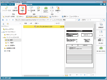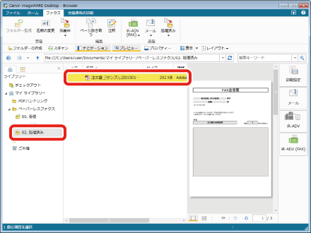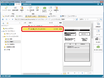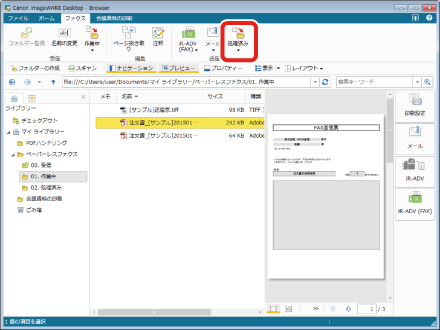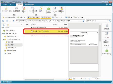 「作業中」フォルダーで返信済みのファクス(ここでは注文書_[サンプル]20150101125534.pdf)を選択します。