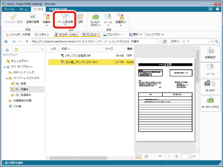 注文書_[サンプル]20150101125534.pdfを選択し、不要なページ(ここでは1ページ目の送信票)をプレビュー表示します。