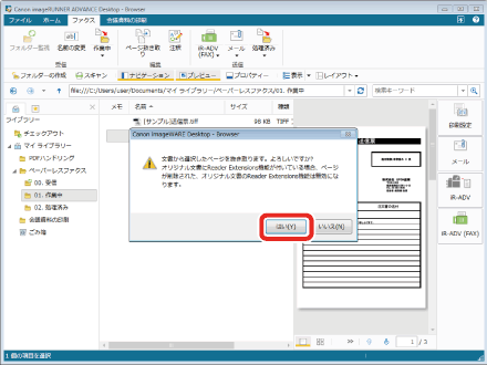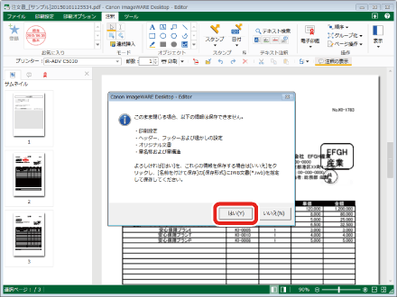 [はい]をクリックします。抜き取られたページが保存されます。(ここでは注文書_[サンプル]20150101125534_1.pdf)