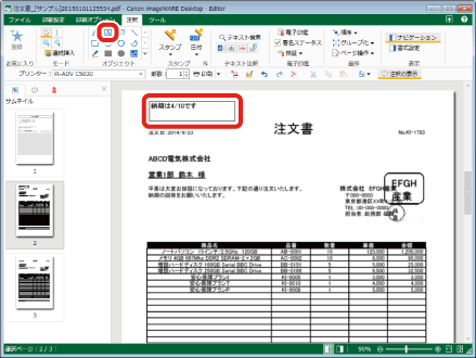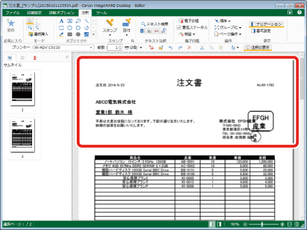 注文書_[サンプル]20150101125534.pdfを選択し、[ファクス]タブの[注釈]をクリックします。Desktop Editorが別画面で起動します。