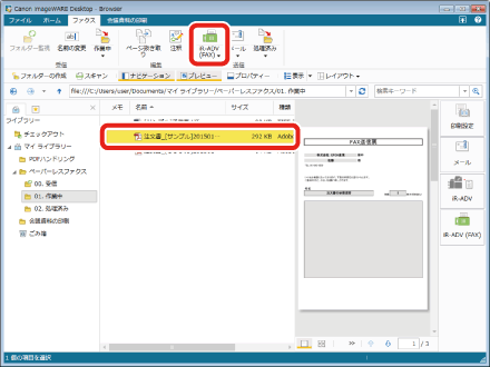 返信用の注文書(ここでは注文書_[サンプル]20150101125534.pdf)を選択し、[ファクス]タブの