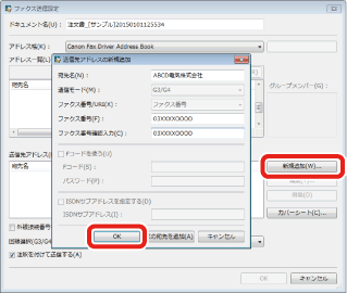 表示されたダイアログボックスで[新規追加]をクリックして表示されるダイアログボックスで、相手先の情報を入力して[OK]をクリックします。
