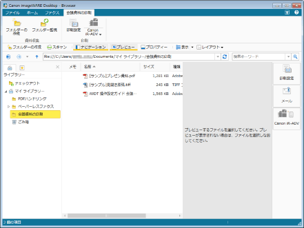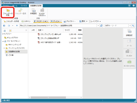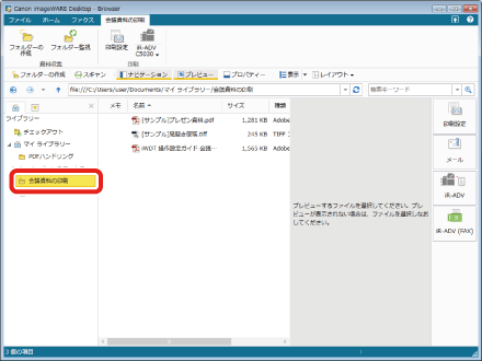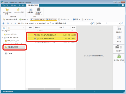 「会議資料の印刷」フォルダーを選択し、[サンプル]プレゼン資料.pdfと[サンプル]見開き原稿.tiffを[Shift]キーを押しながら選択します。