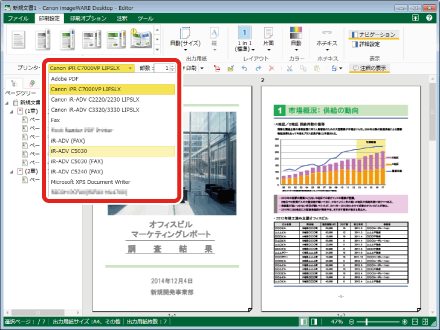 ツールバーの[プリンター]をクリックして、プルダウンリストから印刷に使用する複合機を選択します。選択した複合機の機能が設定できるようになります。
