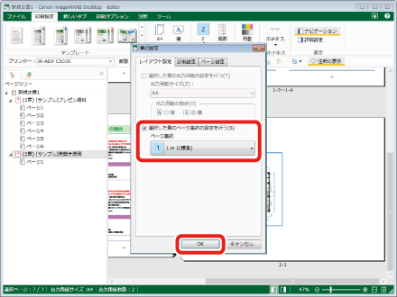 表示されたダイアログボックスで[選択した章のページ集約の設定を行う]にチェックマークを付けます。そのあと[ページ集約]で[1 in 1(標準)]を選択し、[OK]をクリックします。