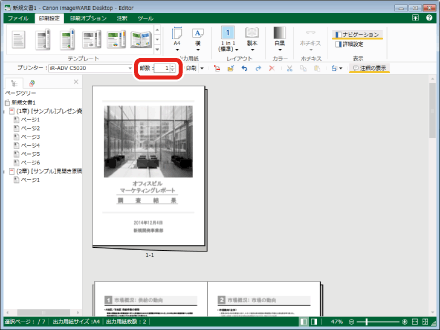 ツールバーの[部数]で印刷する部数を入力します。部数は数字を入力するか、