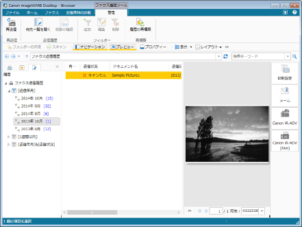 宛先名が表示されます。同報送信されたファクスの場合、プルダウンリストで宛先ごとの送信画像のプレビューを切り替えられます。