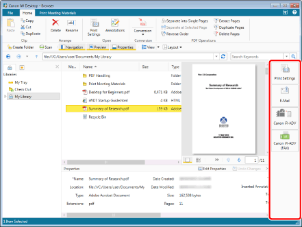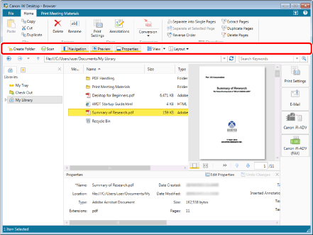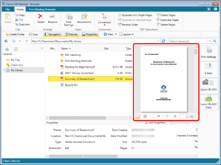 The Properties Window displays the information (properties) of the document or folder selected on the Navigation Window or File List View Window.