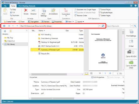 The address bar shows the path of a selected library, My Tray, or folder. You can also click