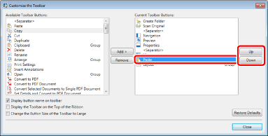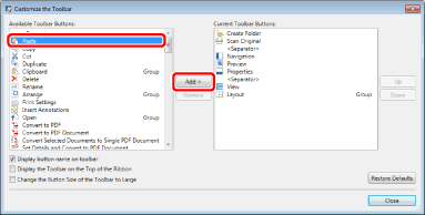 If [Add] is clicked after selecting a button in [Current Toolbar Buttons], the button selected in [Available Toolbar Buttons] is added below the selected button.