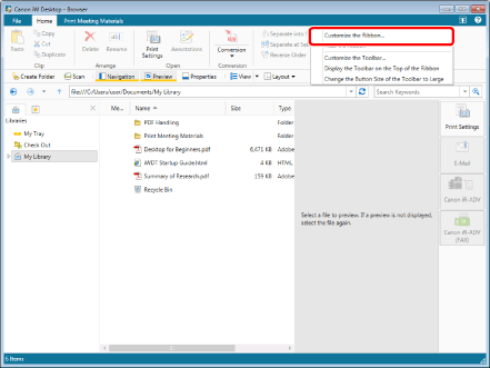 Right-click the ribbon or toolbar and select [Customize the Ribbon].