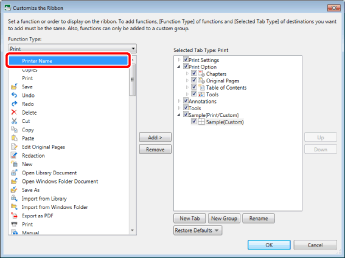 To change the display order of the tabs, groups, and added commands, select the tab, group, or command to change the display order of in the list on the right, and click [Up]/[Down].