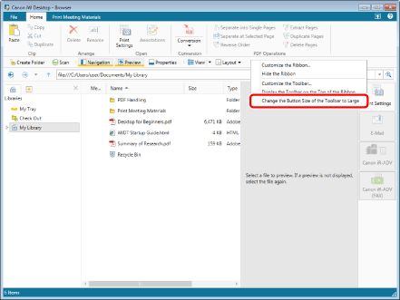 Right-click an area on the ribbon without a command or the toolbar and select [Change the Button Size of the Toolbar to Large].