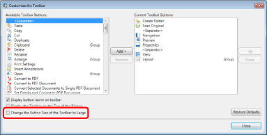 This section describes how to change the buttons displayed in a toolbar to large size buttons.