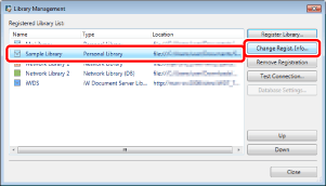 Select a library whose icon you want to change from [Registered Library List] and then click [Change Regist. Info].