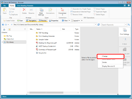 for the printer output button displayed on the ribbon or toolbar and selecting [Change]. If an output button is not displayed on the ribbon or toolbar, see the following to display one. |