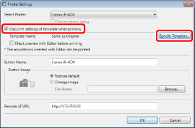 When the [Use print settings of template when printing] check box is selected, a template mark will be added to the printer output button.