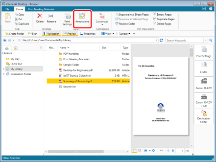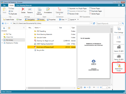If you perform one of the following operations without selecting a document, the Document Destination Folder is selected on the Navigation Window, and you can check the folders and documents in the Document Destination Folder in the File List View Window.