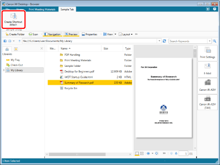 To create and attach a shortcut to e-mail, it is necessary to set [Settings for E-Mail Attachment Files] for the mail output button to [Attach after creating a shortcut] or [Select when attaching]. For more information, see the following.