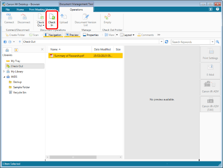For more information on how to check in and register a folder or document in a Document Server Library for which [Require Check Out] is enabled, see the following.