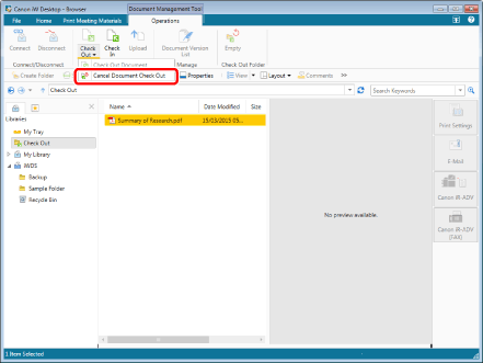 When you cancel check out in the check out folder, cancel the check out status of the Document Server Library, and then delete the document. When you cancel check out while the document is open, canceling the check out is performed, but the deletion of the document fails. You must close the document before deleting it. Delete the document manually after closing it.